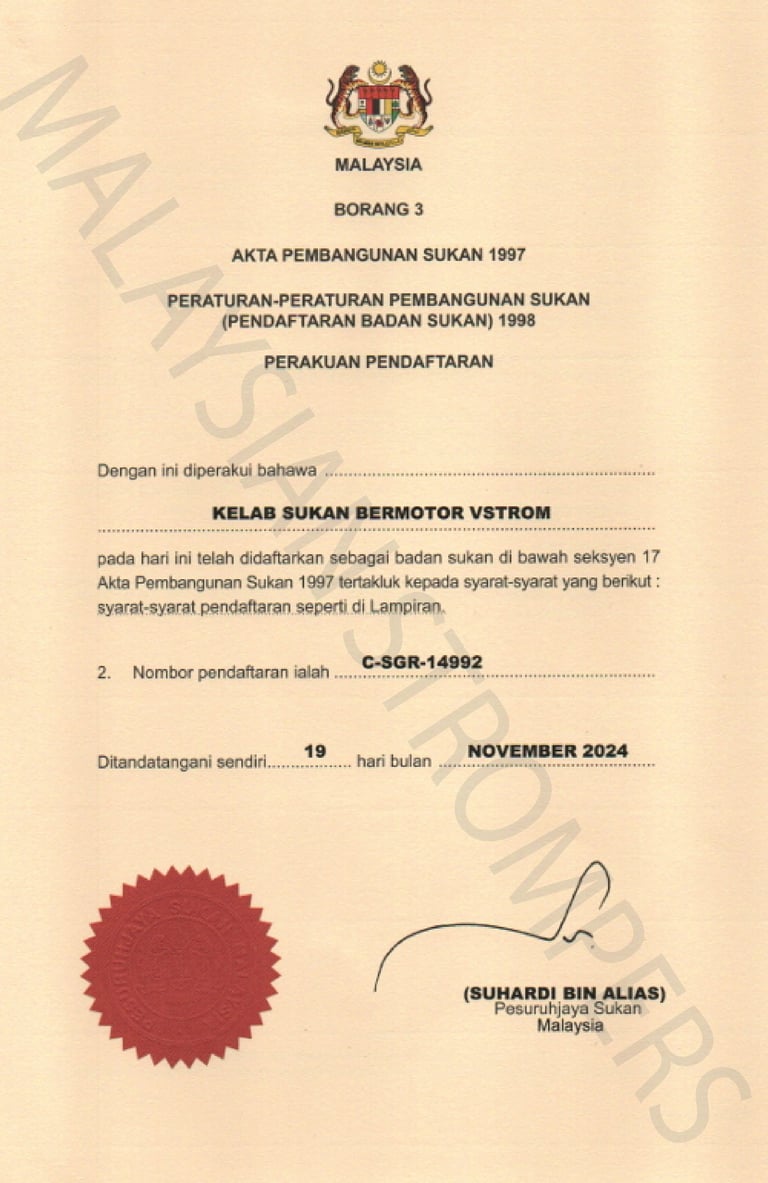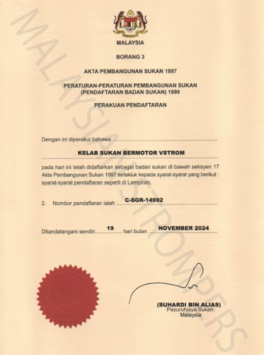 Welcome to Malaysian Strompers, a vibrant community of motorcycle enthusiasts united by our passion for riding. Also recognized as the "Kelab Sukan Bermotor V-Strom," we are proud to be a registered motorsports club under the Malaysian Sports Commissioner, a testament to our commitment to fostering camaraderie and shared experiences among riders. Established officially on November 19, 2024, with registration number C-SGR-14992, we aim to create a supportive environment where members can hone their skills, participate in thrilling adventures, and celebrate our love for motorcycling. Join us as we embark on unforgettable journeys and make lasting memories together on the open road.